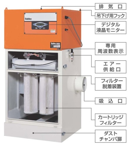 フィルタ表面の付着粉塵を瞬間的に払い落とす。写真は(株)スイデン製カートリッジフィルターの差圧値を自動感知し、あらかじめ設定しておいた差圧値に達すると、カートリッジフィルター外側表面に付着した粉塵を接続コンプレッサーのエアー圧で内側から吹き飛ばします。このエアー圧による逆洗機能を繰り返し行い、常にフィルターをリフレッシュして、集塵能力を自己保持します。