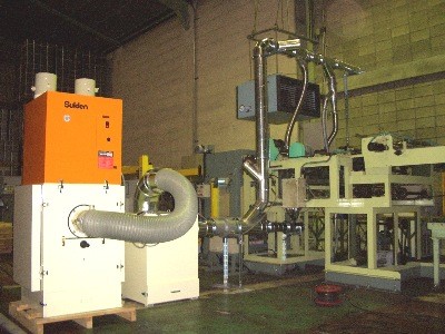 集塵装置の設備されていない自動機に局所集塵装置を設置、集塵機は10馬力。目詰まりの防止にタンカルBOXを設置しました。